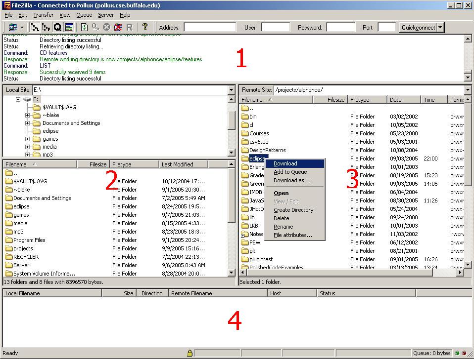 - 3. This is the location and files on the server you're connected to. If you double-click a file, you will download it. However, if you double-click a folder, you will see the contents inside the folder. If you want to download a folder, right-click it and select "download" (see diagram).