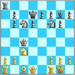 Piece Activity and Development: Black, for the time being, has a lead in development. This is a direct consequence of Garry's forced knight raid to a8. No less than nine of Garry's first fifteen moves have been knight moves (Ng1-f3xd4-e2-c3, and Nb1-c3-d5-c7xa8-b6)! Note also three moves by White pawns (none of which are on the board anymore), and two moves by a White bishop (since departed). This opening is very unusual, don't you think?