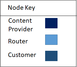 Every client node in $C$ requests a packet of data from the content provider node $i \in V$. The packet addressed to a client $c \in C$ is denoted by $\text{pkt}_c$.
