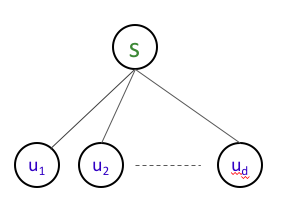 Now, let us make things bit more general. Say the connected component of $s$ is a “star” (or a tree of depth 1) graph, like so: