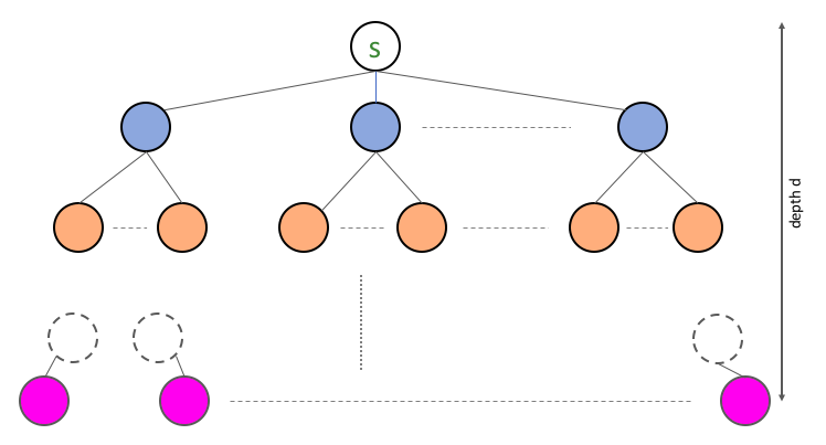 The idea is not to stop at the orange nodes, but then explore the neighbors of the orange nodes and then the neighbors of their neighbors etc. till you get to the pink nodes (i.e. the last level of the tree). All we need to do now is in 4 go on till depth d, like so: