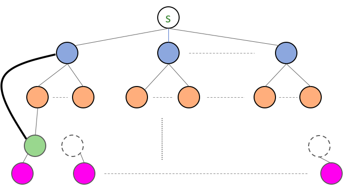It works! Let’s look back at how the algorithm will run on this specific graph. When the algorithm is creating L[2] from L[1] (i.e. the blue nodes), then L[2] in addition to having the orange node will also have the green node in it. So effectively “pull” up the subtree rooted at the green node. The situation would look like this