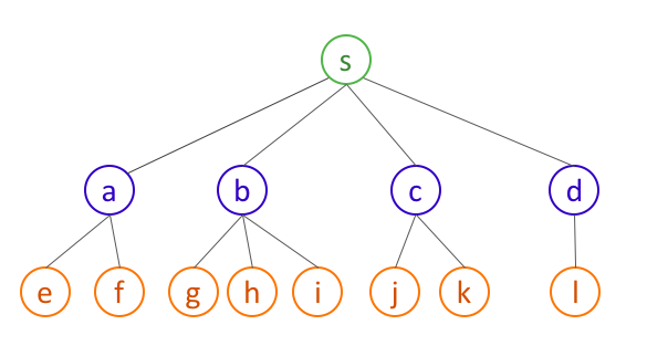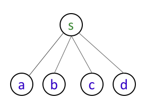 Now, let us make things bit more general. Say the connected component of $s$ is a “star” (or a tree of depth 1) graph, like so: