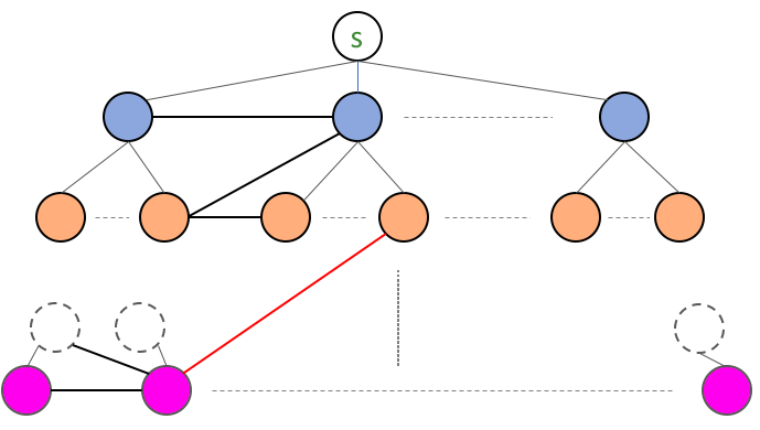 It works! Let’s look back at how the algorithm will run on this specific graph. When the algorithm is creating L[2] from L[1] (i.e. the blue nodes), then L[2] in addition to having the orange node will also have the green node in it. So effectively “pull” up the subtree rooted at the green node. The situation would look like this